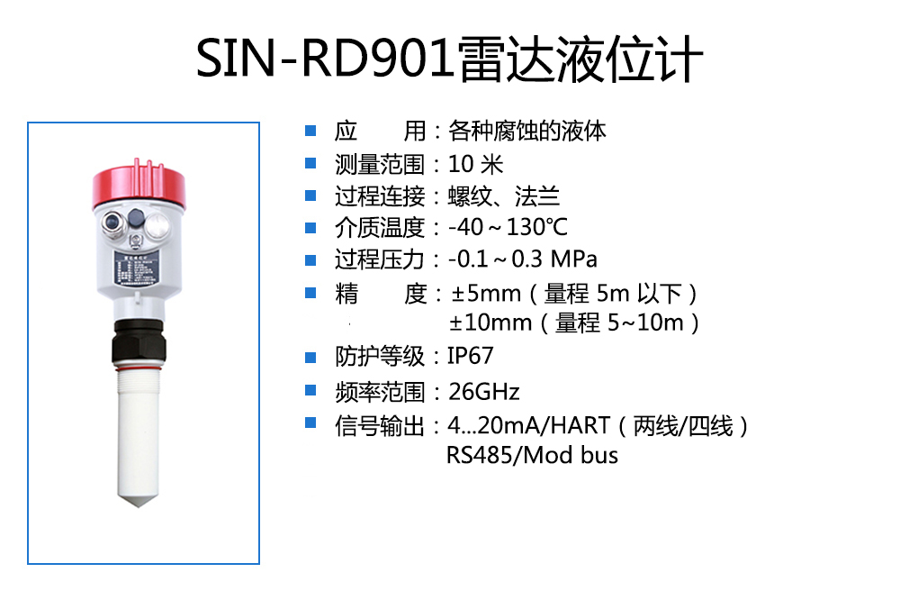 90 系列傳感器是 26G 高頻雷達(dá)式物位測量儀表,測量最大距離可達(dá) 80 米。天線被進(jìn)一步優(yōu)化處理,新型快速的微處理器可以進(jìn)行更高速率 的信號分析處理,使得儀表可以用于各種強(qiáng)腐蝕性液體的測量。