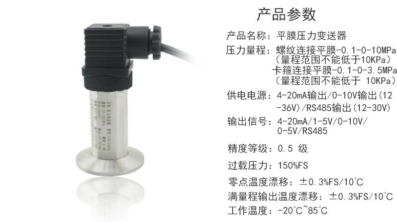 平膜結(jié)構(gòu)壓力變送器采用波紋膜直接感受壓力。傳 感器平膜片防止了污垢,不衛(wèi)生及粘稠液體堵塞等問(wèn)題。 具有體積小、重量輕、長(zhǎng)期穩(wěn)定性好等特點(diǎn),廣泛應(yīng)用 于食品、醫(yī)藥、衛(wèi)生及釀酒工業(yè)等行業(yè)。